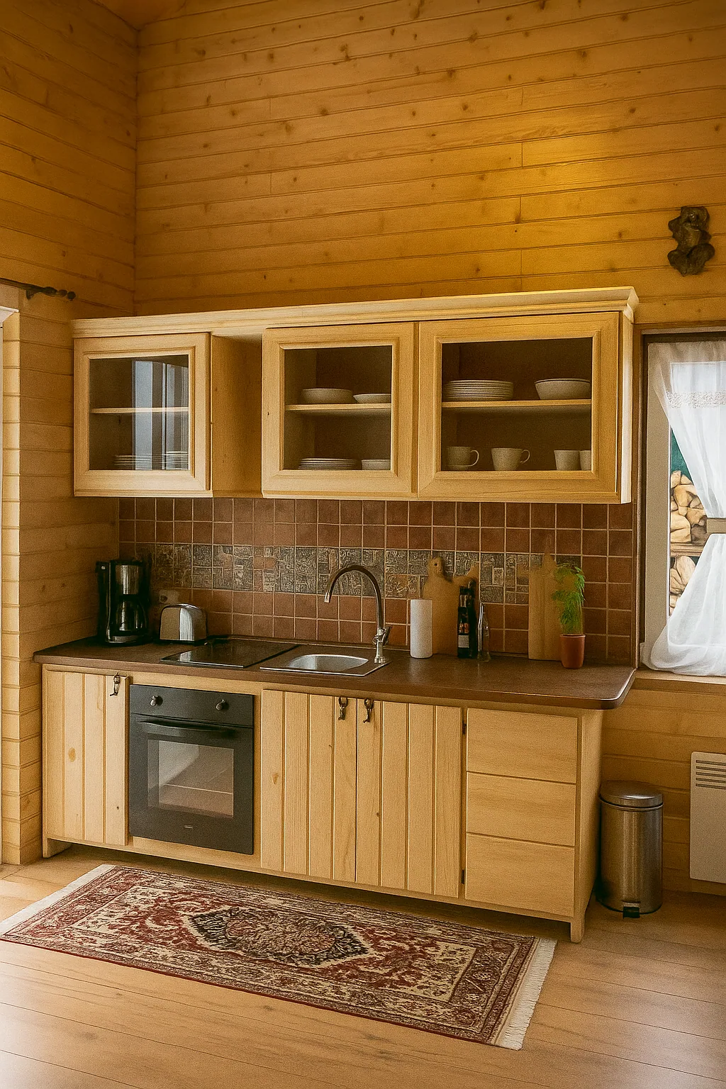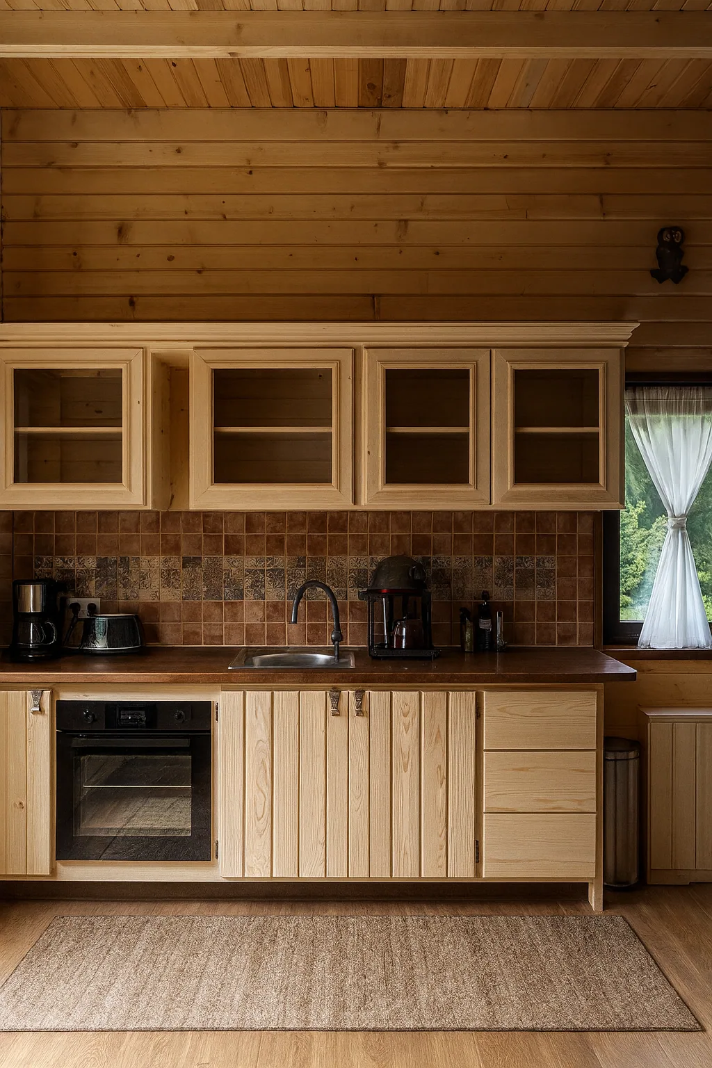Bucatarie Rustica Eleganta Comandau pune in evidenta bucatarie rustica-eleganta cu compozitie continua pe perete. Piesa este dezvoltata ca referinta reala din atelier pentru proiecte de bucatarie pe comanda.